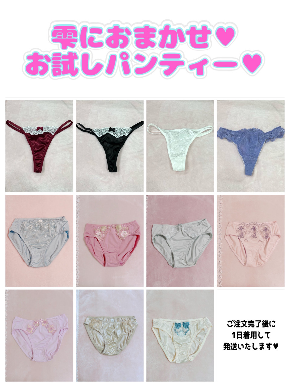 こんばんは♡雫です! 年末年始忙しくしており、少し期間が空いてしまいました💦 雫のことをもっと知っていただけるように、お試しパンティーを出品しました💕 詳細は出品ページをご覧ください✨