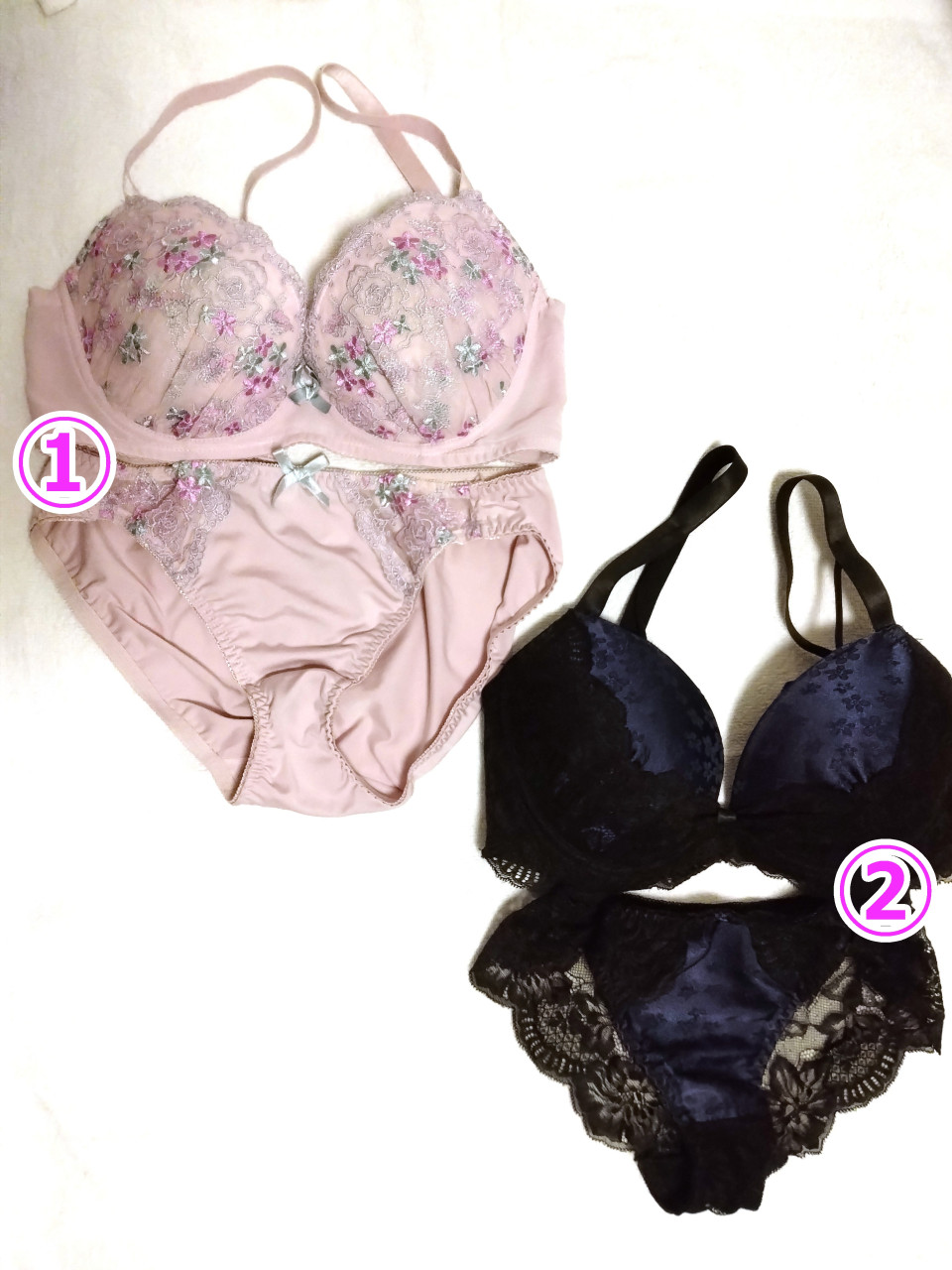 ★いつでも着用OKです★ 番号が小さいほど、シミや毛玉が目立って、クタクタ感強めです。。。 ①ピンク×水色のお花の刺繍 Fcup ②青い花柄サテン×黒レース Gcup