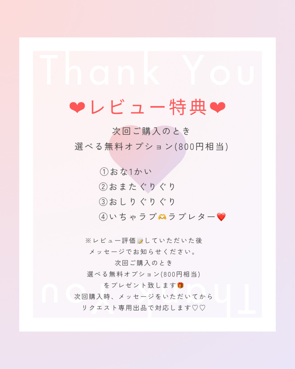 事前にメッセージ(レビュー無料特典希望のむね、ご希望のオプションの該当する番号を①〜④のいずれかを記載)